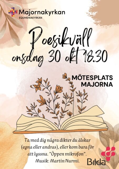 Poesikväll. Ta med dig några dikter du älskar, eller kom bara för att lyssna. ”Öppen mikrofon”. Musik Martin Nurmi